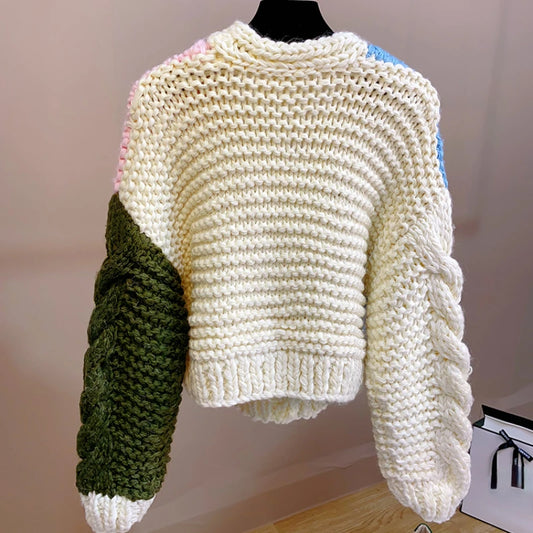 Chunky Knit Cardigan Women Handmade Patchwork Mix Color Loose Sweater Cardigan Winter Knitwear