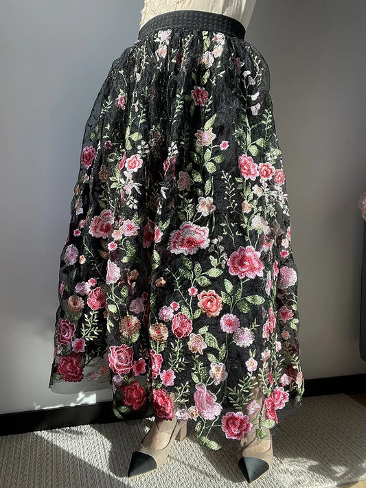 JIAMI Luxury High Waist Floral Pleated Black Tulle Skirt