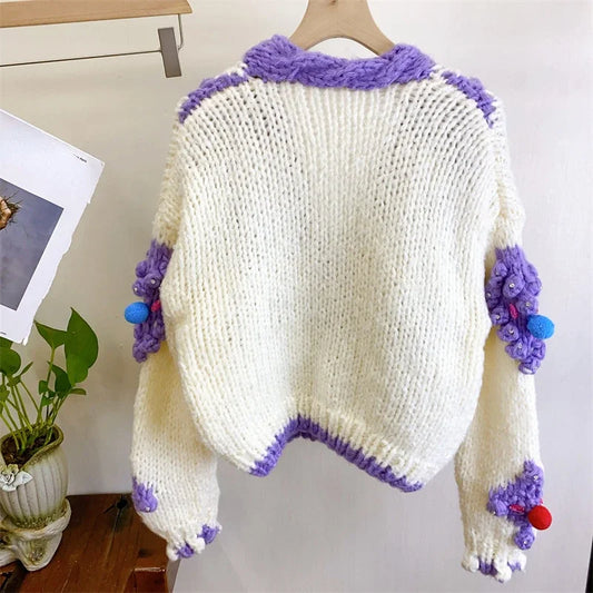 Kalamet Women Handmade Floral Multicolor Chunky Cardigan Sweet Winter Sweater Knit Top Women Clothes