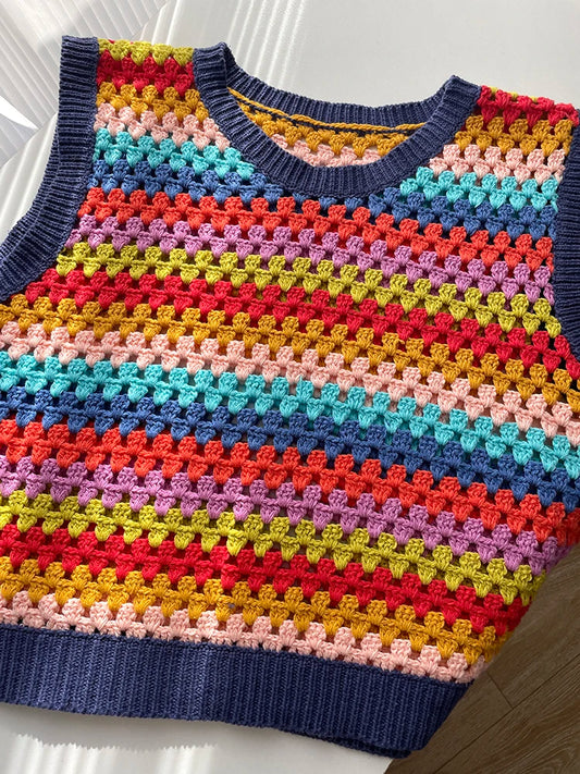 Kalmet Handmade Rainbow Color Stripe Knit Vest