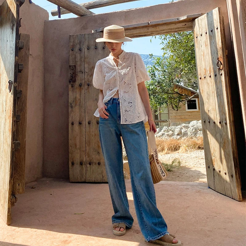 Crafted from soft, breathable cotton, this blouse features intricate embroidery and delicate hollow-out detailing, adding a touch of sophistication to your ensemble. The short sleeves and relaxed fit ensure comfort and style throughout the day.